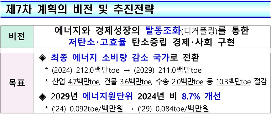제7차 에너지이용합리화 기본계획의 비전은 '에너지와 경제성장의 탈동조화(디커플링)를 통한 저탄소·고효율 탄소중립 경제·사회 구현'이다. 최종 에너지소비량 감소 국가로 전환하는 것이 목표다. 목표 달성을 위해 2024년 최종에너지소비량 2억1,200만toe에서 2029년 2억1,100만toe로 줄인다. 산업 470만toe, 건물 360만toe, 수송 200만toe 등 1,030만toe 절감를 실현한다. 2029년 에너지원단위(0.084toe/백만원)는 2024년(0.092toe/백만원)대비 8.7% 개선시킨다.