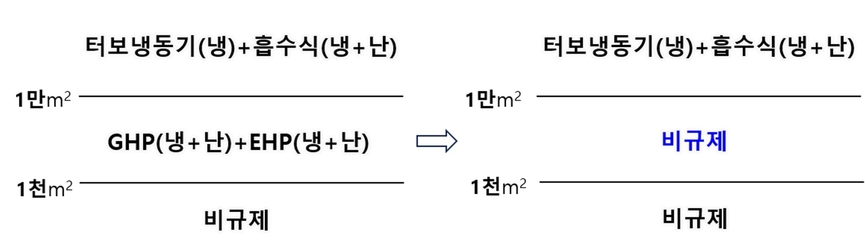 기축건물의 경우 목표 에너지원단위제도 지자체 시범사업·공공 의무화 등 확산을 위해 대형건물 밀집 지자체 중심 건물별 에너지원단위 등급평가 시범 실시해 2027년부터 공공기관 소유 건축물을 대상으로 제도를 의무화한다. 노후 아파트, 1,000개 단지를 2029년까지 발굴해 변압기, 밸브·열교환기, 냉난방설비, 태양광 등 에너지공기업 지원사업을 패키지로 지원하는 그린홈 패키지실시한다. 기초생활수급자, 차상위계층, 저소득가구 등 주택 효율개선도 별도하며 비전기식 냉방설비 설치의무 축소도 추진된다. 이를 위해 연면적 1만㎡ 미만 건축물 비전기식 의무 대상에서 제외해 GHP에서 EHP로의 전환을 유도한다.