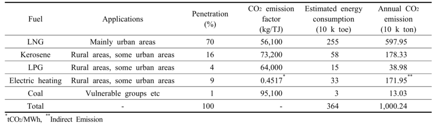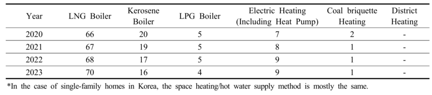 현재 단독주택 난방에는△도시가스 △등유보일러 △LPG보일러 △연탄보일러 등이 활용된다. 농촌지역은 △LPG △등유 △전기 등의 사용비율이 상대적으로 높으며 96% 이상이 개별난방형태를 유지 중이다.