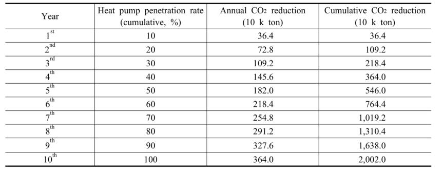 또한 시나리오에 따라 히트펌프를 매년 10%p씩 보급을 확대해 10년차에 전환이 완료될 경우 연도별 감축량은 초기 36만4,000톤에서 점차 늘어나 10년차에 364만톤에 도달해 10년간 누적감축량은 약 2,002만톤에 이를 것으로 전망된다.