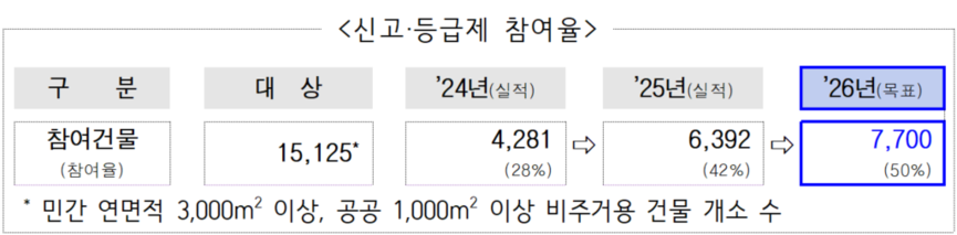 먼저 시는 연면적 1,000m² 이상 공공건물과 3,000m² 이상 비주거용 민간건물의 건물에너지 신고·등급제 참여를 적극 유도해 해당 규모 건물의 약 50%인 7,700개소까지 확대할 예정이다.
